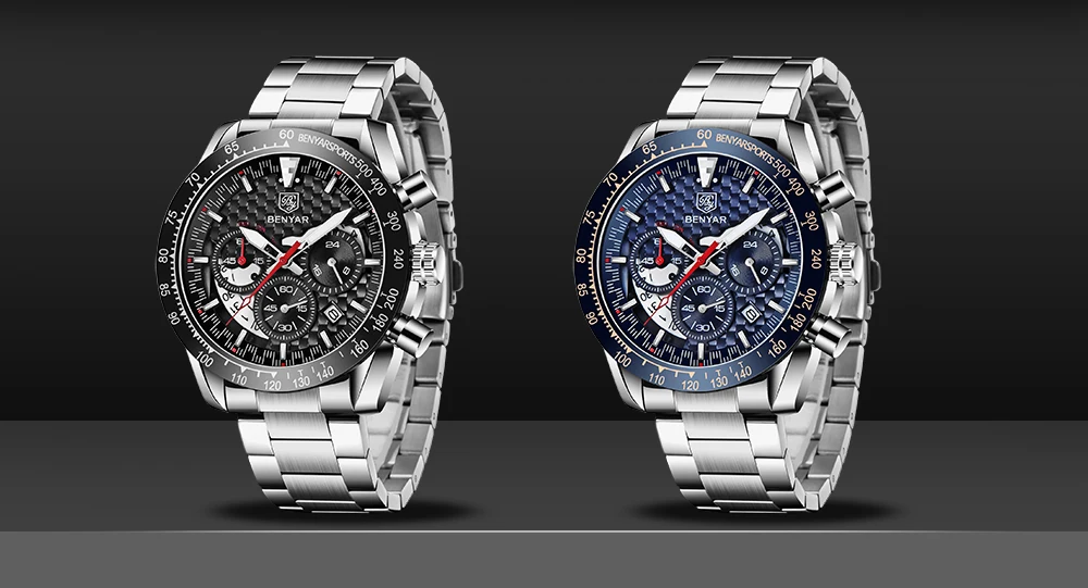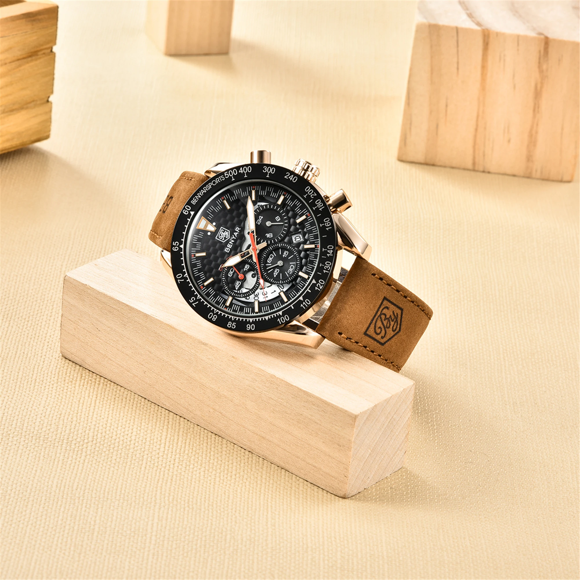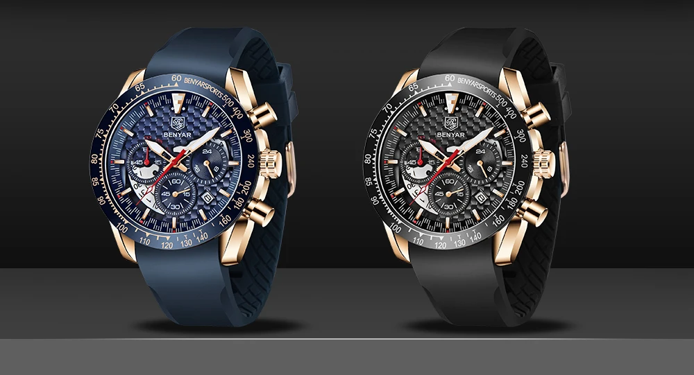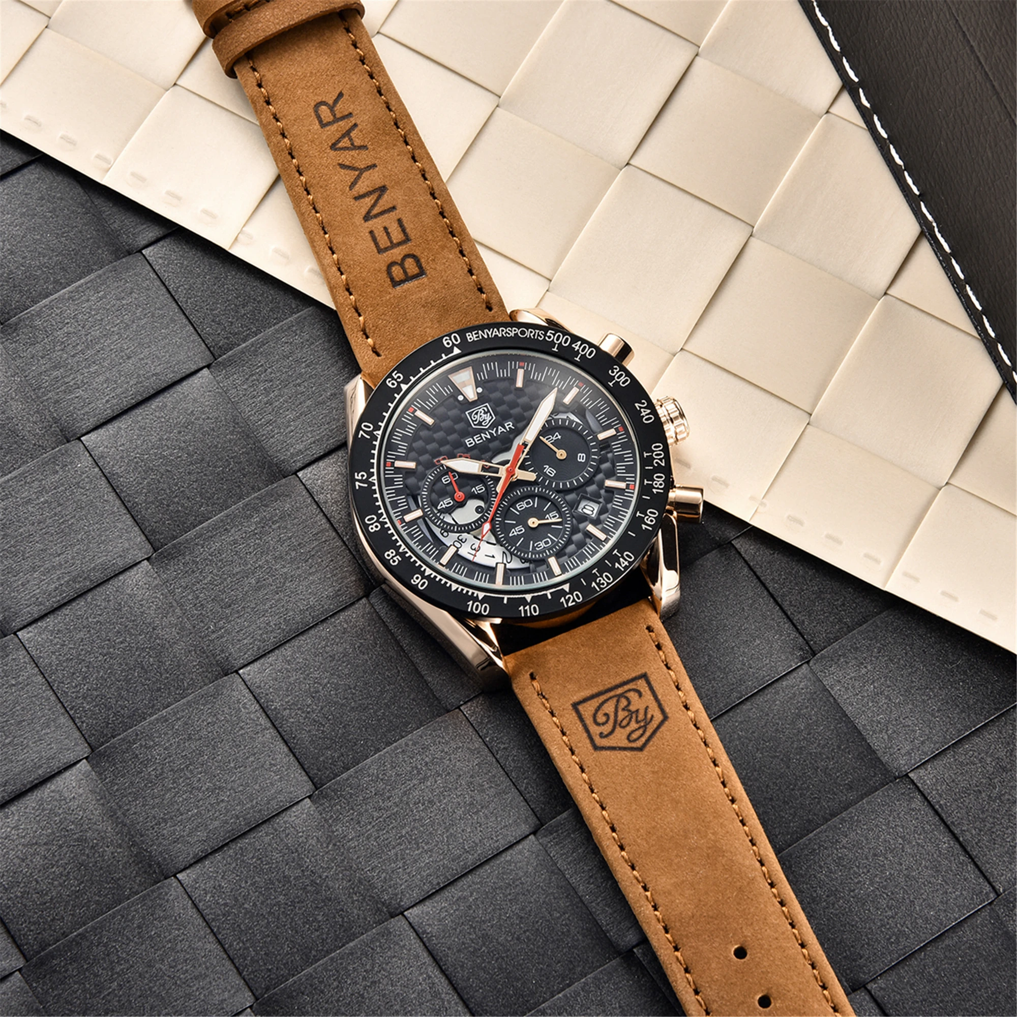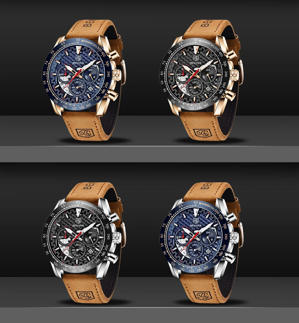 • Pulseira de couro de luxo :Experimente o luxo e o conforto do relógio masculino Benyar com sua pulseira de couro de primeira qualidade, projetada para o cavalheiro elegante que valoriza tanto a forma quanto a função.